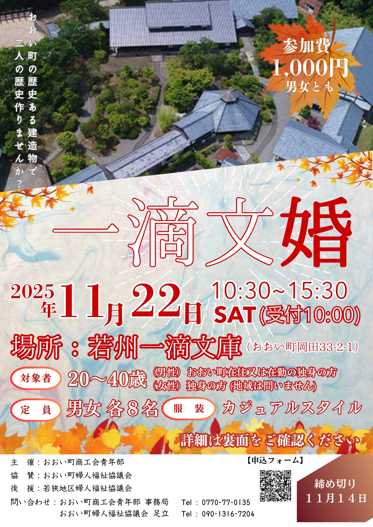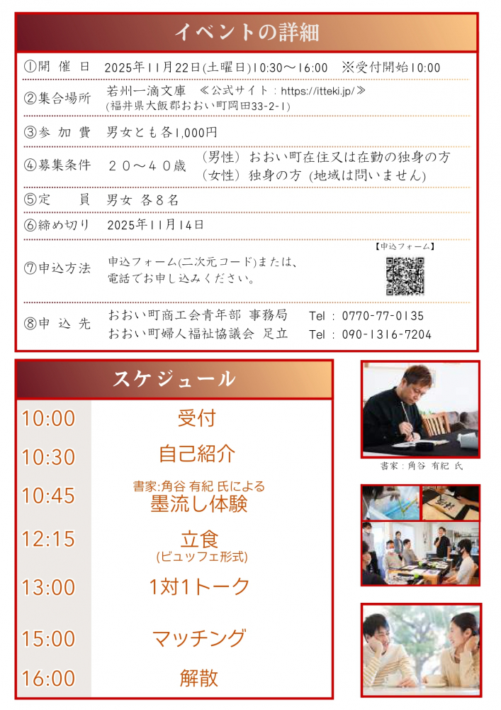 【申込方法】チラシ記載の申込フォーム二次元コード、上記おおい町商工会青年部事務局または足立まで電話