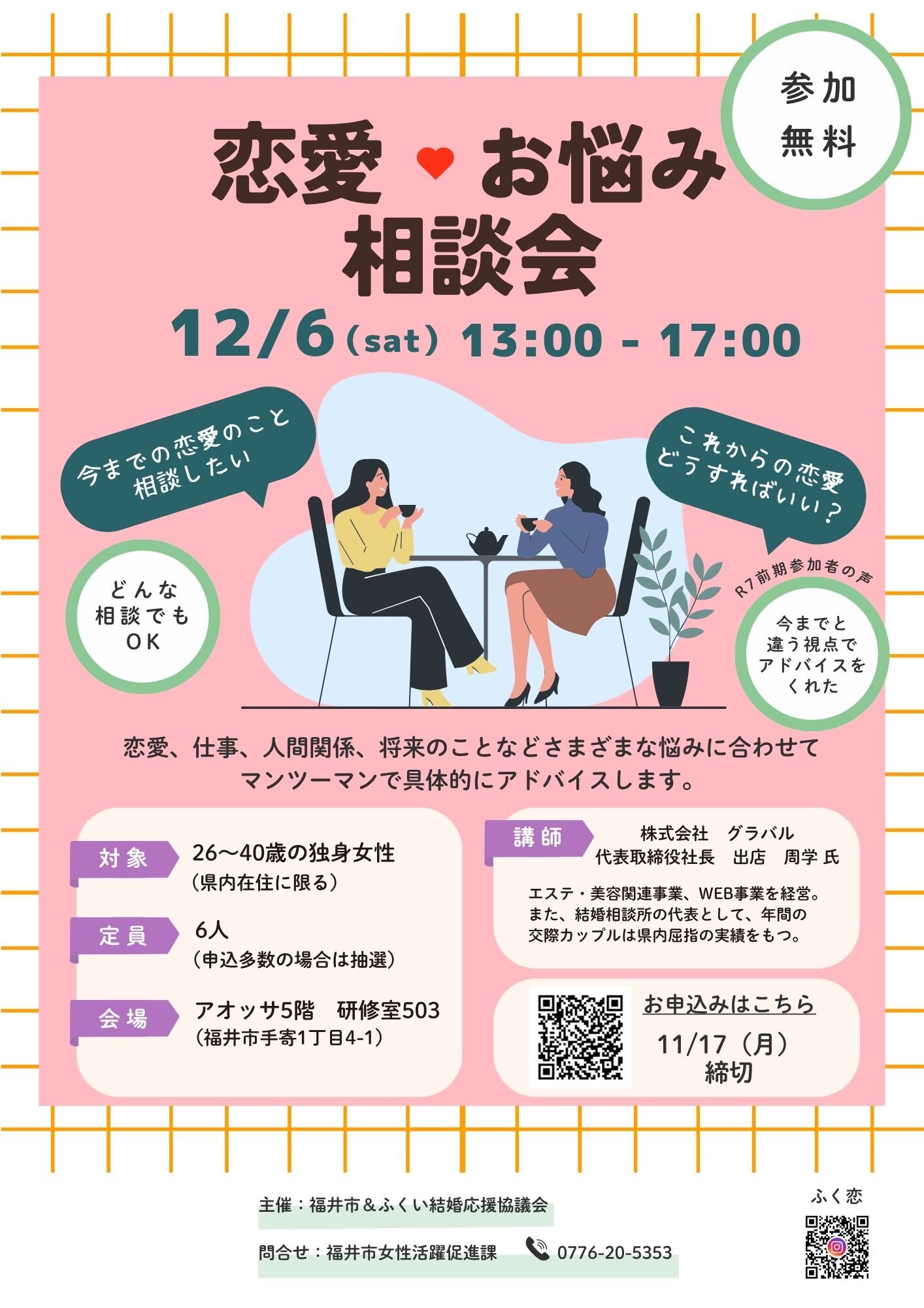 「今までの恋愛で相談したいことがある…」、「これからの恋愛について、誰かに聞いてほしい…」という方のための、恋愛・お悩み相談会を開催します。