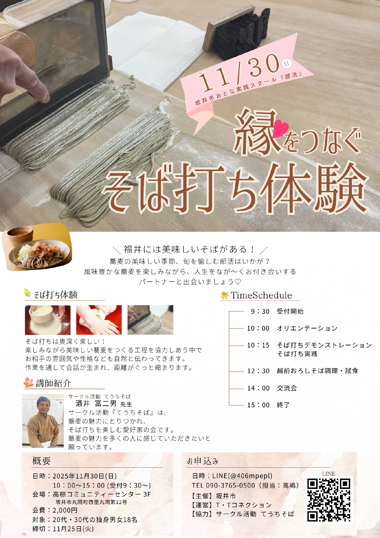 そば打ちを通して、伝統文化への理解と親しみを深めながら、参加者同士の交流も楽しめます。自分磨きだけでなく、新たな出会いの場として参加してみませんか。