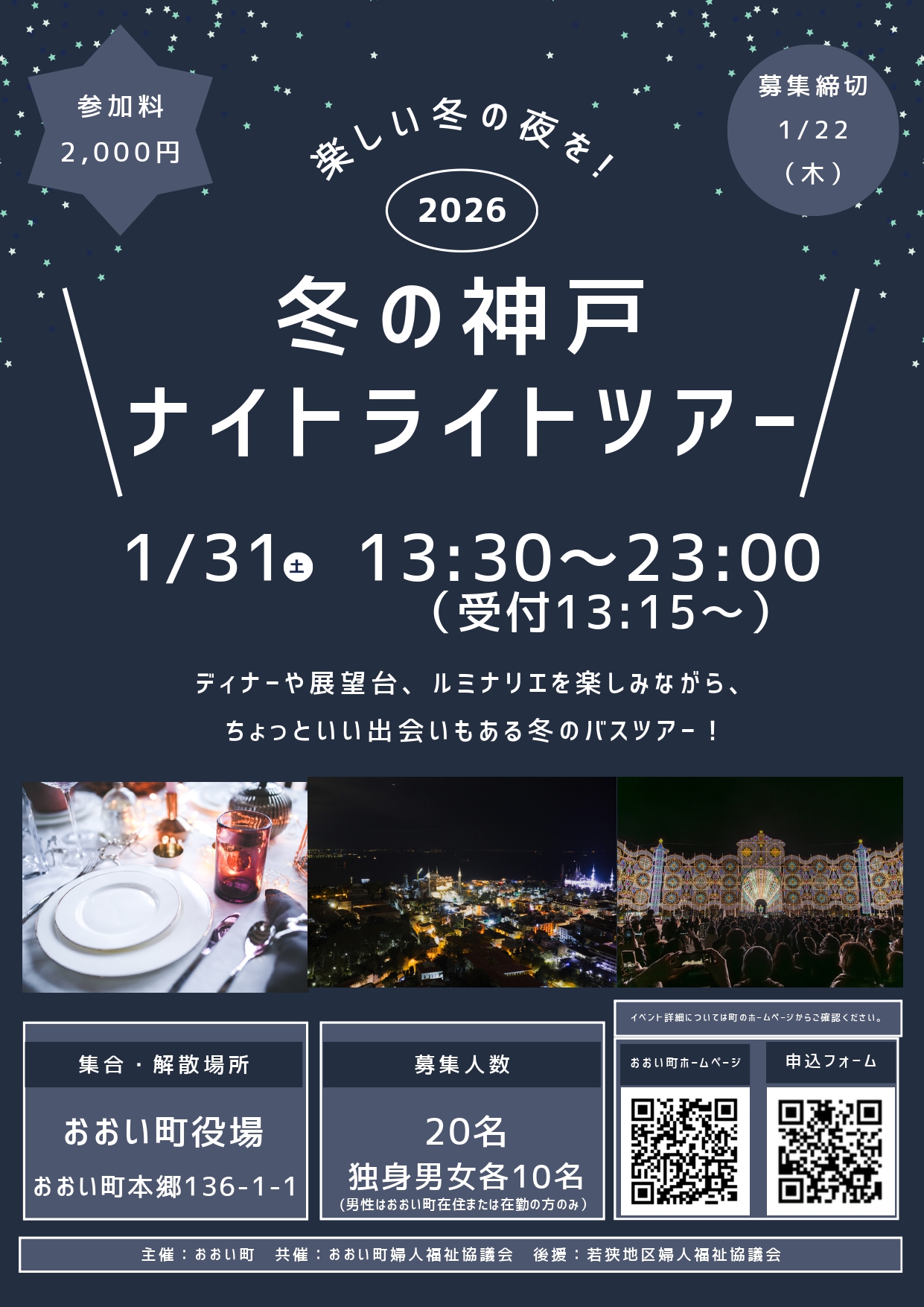 神戸市内でディナーをとり、神戸ポートタワーからの夜景、神戸ルミナリエを鑑賞していただきます。