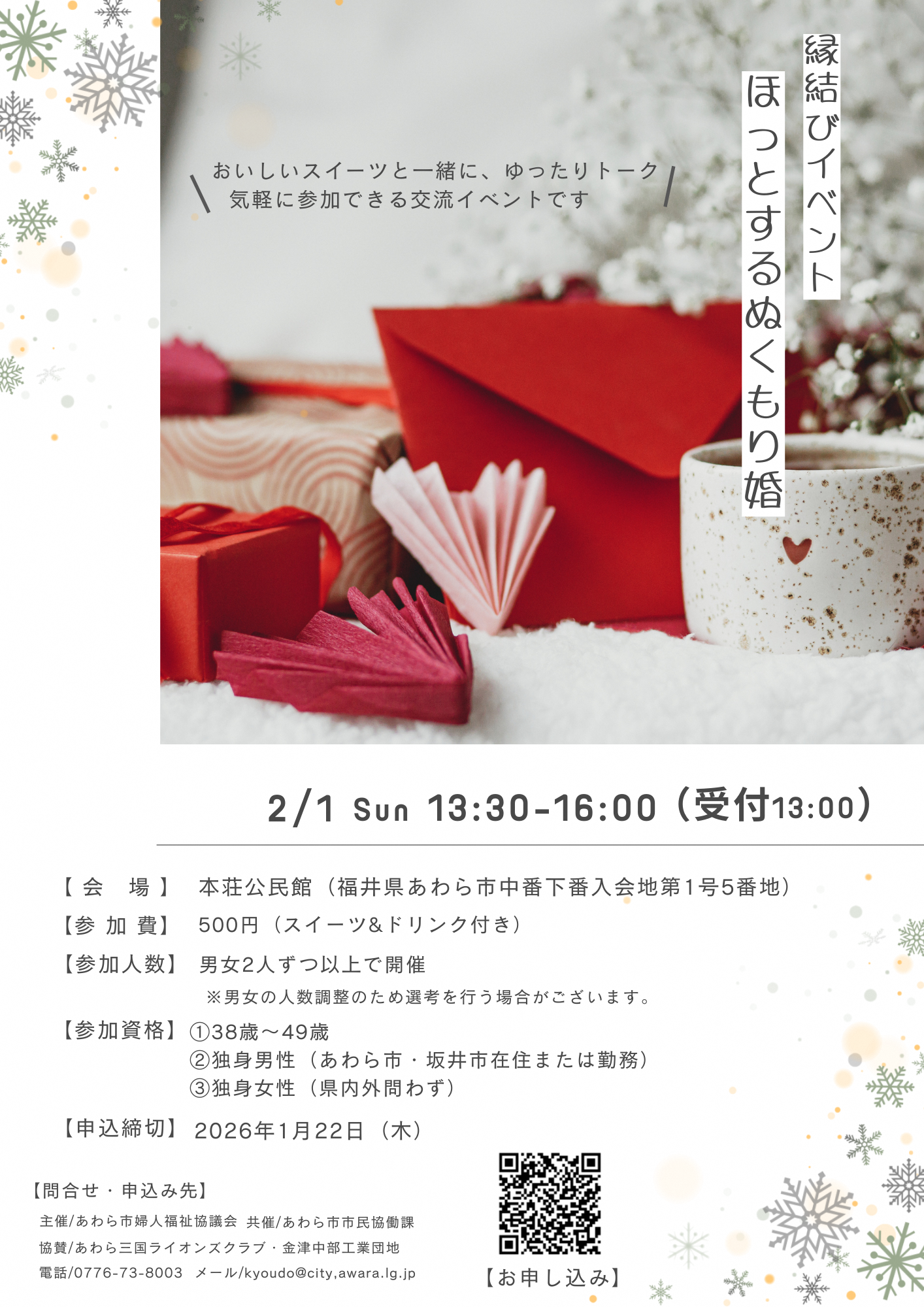 38歳~49歳の独身男性で、あわら市坂井市に在住または勤務されている方