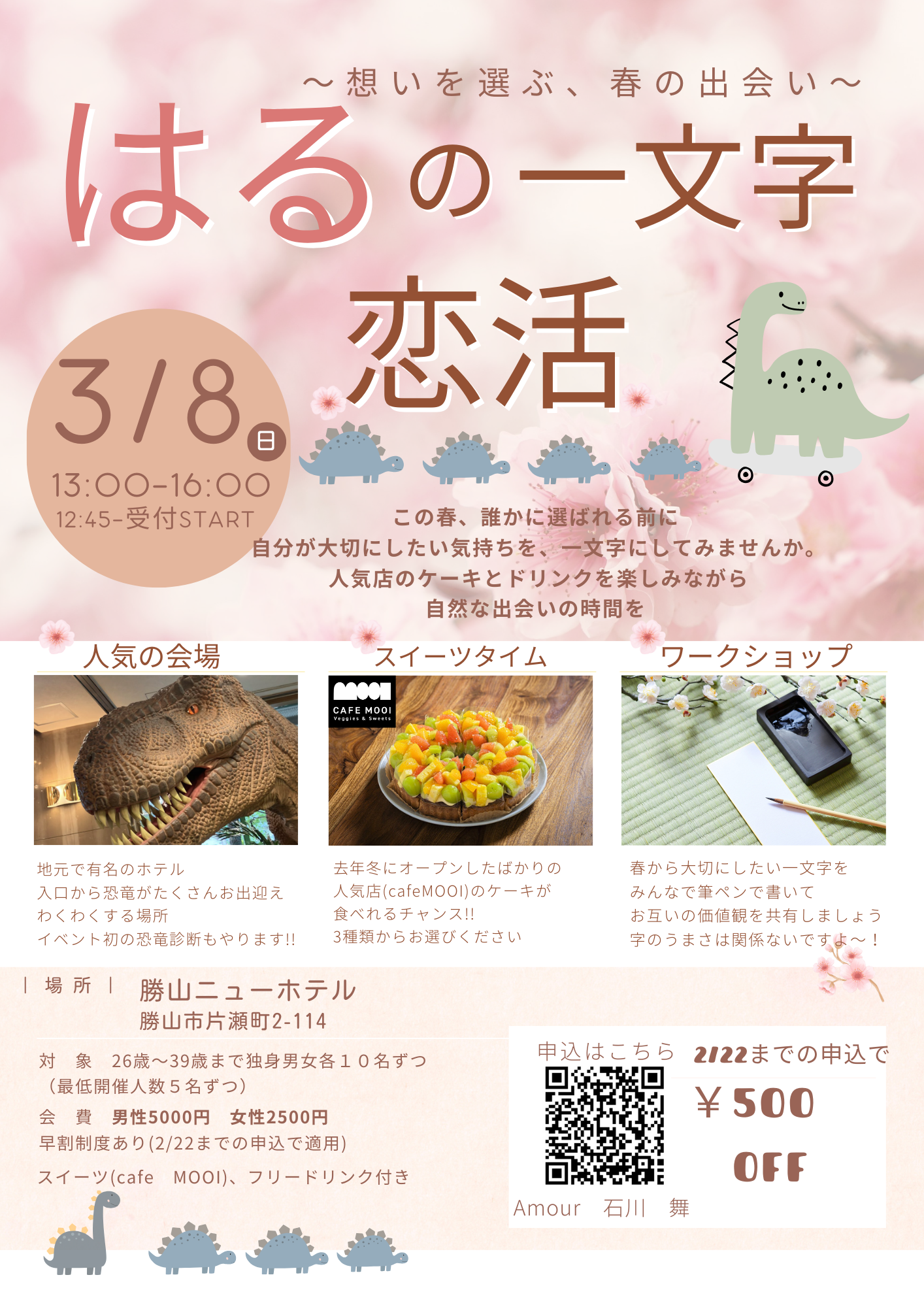 「はるの一文字恋活」は、春から大切にしたい想いをワークショップで一文字にしながら、自然に会話が生まれるやさしい婚活イベントです。会場は恐竜で有名な勝山ニューホテル。ちょっと特別な空間で行う“恐竜タイプ診断”もあり、自分や相手の性格傾向を楽しく知ることができます。