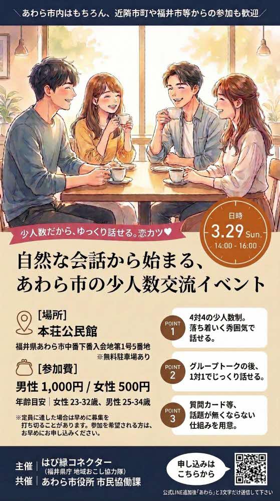 【申込方法】公式LINEに「あわら」と3文字送信してください。折り返しGoogleフォームのURLをお送りしますので、そちらからお申し込みをお願いします。https://line.me/R/ti/p/@187xsjgy