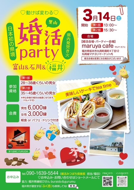 ここがオススメ:北陸で話題のMC FUKUDAが楽しく進行して皆様が自然体で素敵なお相手探しができるように努めます。婚活みつばち倶楽部のスタッフ一同皆様にお会いできることを楽しみにしております。素敵なご縁になりますように。