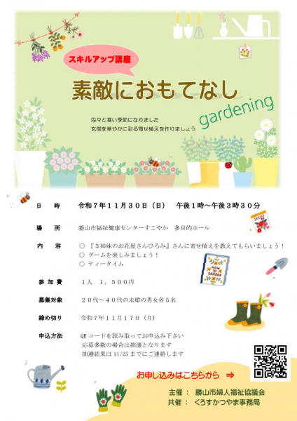 県・市町 募集中   素敵におもてなし gardening2025年11月30日(日)13:00 20代~40代の未婚の男女各5名 1,500円 締切11月17日(月) 主催自治体勝山市