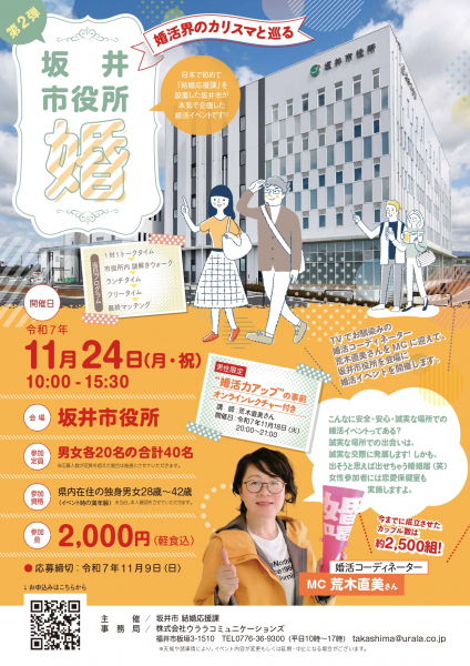 県・市町 募集中   婚活界のカリスマと巡る坂井市役所婚2025年11月24日(月)10:00 28~42歳の独身男女 各20名 2,000円 締切11月9日(日) 主催自治体坂井市